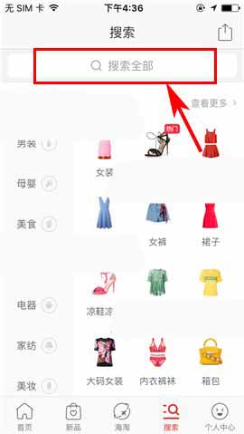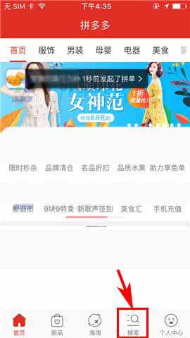 1)点开拼多多APP,首先点击首页界面中的【搜索】,随后点击搜索框;(如下图)