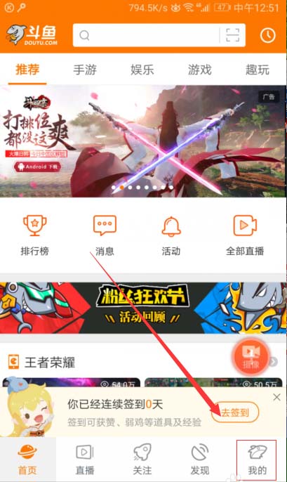 2、来到了斗鱼APP首页,在这里,我们点击“我的”,如图。