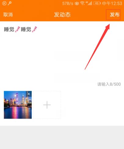 6、在编辑界面,我们输入我们要发的图片,以及找到我们要发布的图片,设置好,点击上方的“发表”,我们就可以发表动态了,如图。