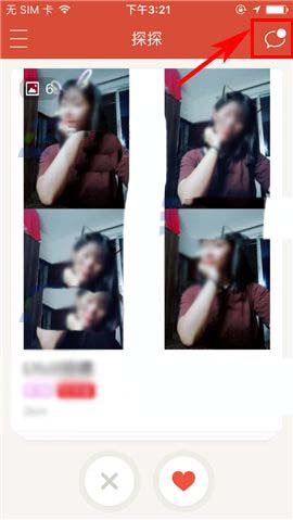 1)点开探探APP,首先点击首页右上角处的【消息】图标,然后在列表中选择相关的聊天会话栏;(如下图)
