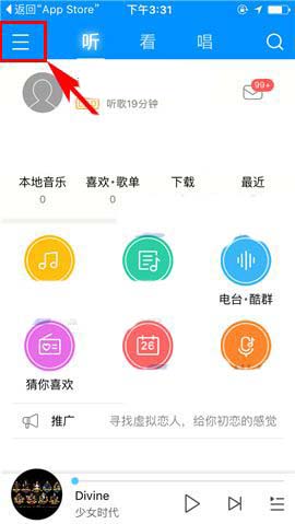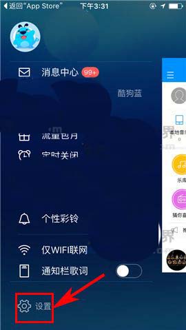 1)打开手机酷狗音乐,首先点击首页面中左上方的“三横”符号,然后再点击界面左下角处的【设置】;(如下图)