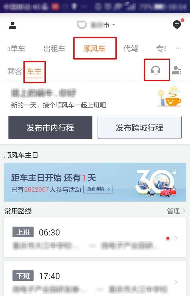 2、在屏幕上方选择顺风车-车主-点击耳机形状图标.