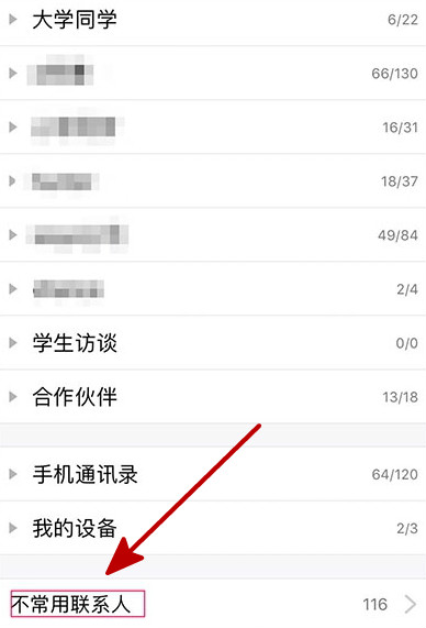 4、被隐藏的“非常用好友”,可以在联系人列表底部的“非常用联系人”分组中看到,与这些联系人发送或者接收消息不会收到影响。