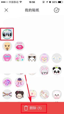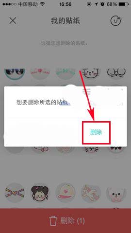 2)接着就点击一个或者多个需要删除贴纸图案,再点击底部的【删除】,最后会有提示框弹出来,点击【删除】就可以啦。(如下图)