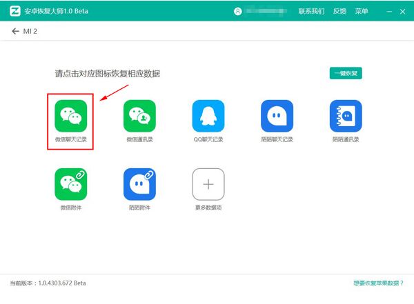 步骤三:此时我们可以看到安卓恢复大师所支持恢复的7种数据了,这里我们仅需点击【微信聊天记录】即可。
