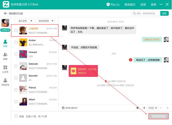 步骤四:此时软件会进入到数据的扫描界面中,此时由于数据的恢复是一项极其复杂的科学运算,这个过程可能需要我们等待片刻。扫描完成之后需要我们选择恢复的微信账号,选择完毕之后即可进入该账号下微信聊天记录。其中以橘黄色字体展示的就是我们之前删除的记录,而以黑色字体展示的是我们手机中保留的数据,筛选出自己所需要的数据后,随后点击右下角的【恢复到电脑】就可以将数据保存在电脑中进行查看了。