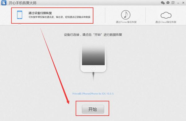步骤二:这时我们需要用数据线将手机连接上电脑,手机上可能会显示是否信任本电脑,此时选择信任即可,之后即可等待软件自动连接上设备,在软件显示设备已连接之后,即可选择【通过设备扫描恢复】,然后再点击【开始】