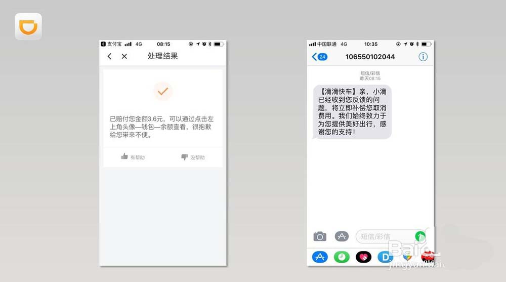 3、投诉完毕后,滴滴会赔付你的取消费金额,金额查看路径为「头像」-「钱包」-「余额」,不过由于我是使用蚂蚁花呗支付,金额退回花呗额度。随后,滴滴还通过短信的方式告知反馈问题的处理结果。