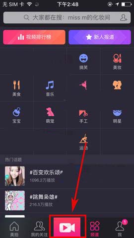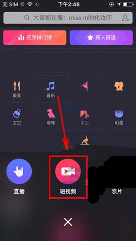 1)打开美拍软件之后,点击正中间的【摄影】图案,接着选择【短视频】并点击;(如下图)