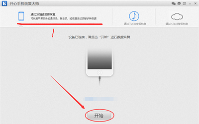 想要恢复删除的微信记录,其实也可以变得很简单,不信的话我们一起来看一下吧: 苹果手机微信聊天记录恢复教程:第一步:下载安装开心手机恢复大师(官网地址:http://www.kxbox.com/)软件到自己的电脑上,考虑到很多人都没有备份文件的所以今天来讲一下第一模式:“通过设备扫描恢复”;