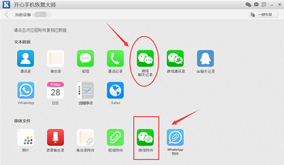 第三步:点击之后就正式进入到数据恢复的图标界面了,然后直接找到微信相关的“微信聊天记录”或者“微信附件”等图标相应点击即可;