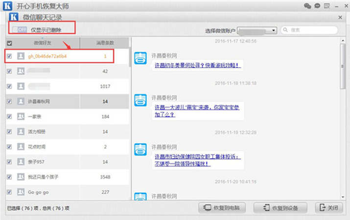 步骤四:此时安卓恢复大师会对设备中的数据进行扫描,而您只需要等待一段时间即可。在扫描结束的后,软件会需要您选择恢复的微信账号,选中需要恢复的微信账号即可进入微信聊天记录的数据页面。在此页面中,以橘黄色字体显示的则为之前删除的微信记录,而以黑色字体显示的则为未删除的记录。此时您只需根据需要选中聊天记录,然后再点击软件右下角的【恢复到电脑】即可完成恢复。