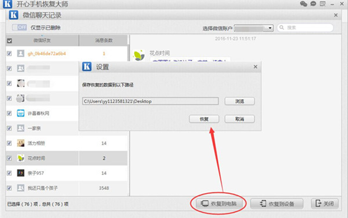 第五步:最后,找到想要恢复的微信聊天记录,在前面方框勾选出来,然后点击软件下方的“恢复到电脑”的按钮,就可以将这些微信数据导出到电脑上保存了。