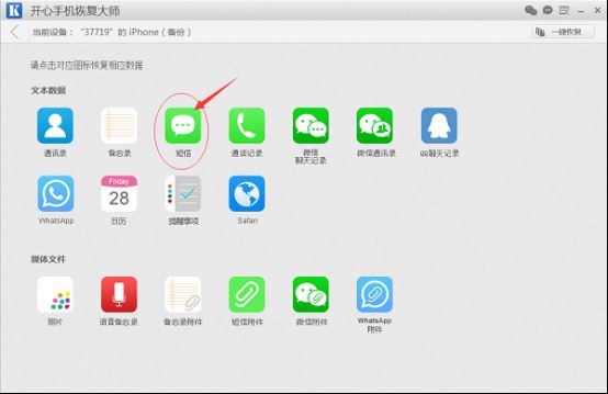 步骤五:下载完成之后,我们进入到一个由文本数据和媒体文件组成的17个不同的数据项,然后我们找到图标【短信】点击继续下一步。