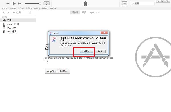 首先我先将旧的苹果手机备份到iTunes上去,打开电脑上的iTunes软件,连接到电脑上.如果该手机是第一次在这台电脑上使用会出现是否允许访问的字样,我们点击“继续”就可以了。