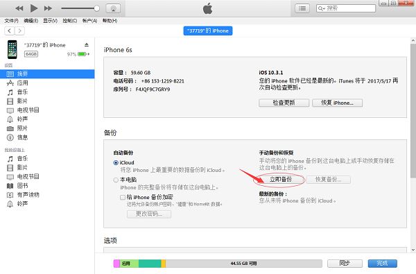 步骤三:我们点击摘要那一栏,在界面的右下角出点击按钮“立即备份”,然后等待iTunes将手机全备份。