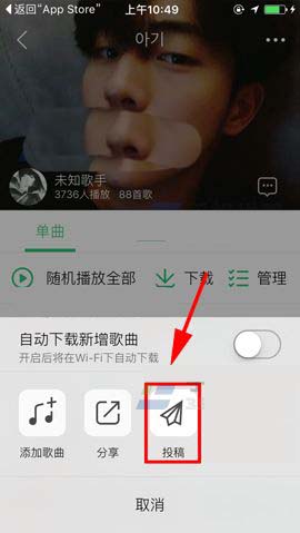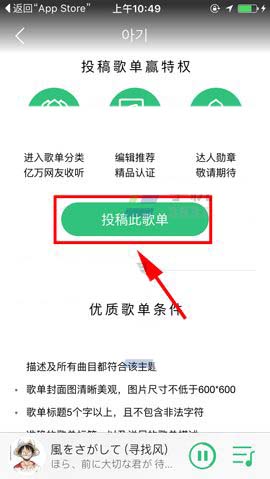 2)弹出选项后我们在点击【投稿】,接着再点击【投稿此歌单】。(如下图)