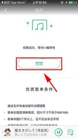 3)最后完成投稿后我们点击【完成】等待QQ音乐小编审核你的歌单就可以了。(如下图)