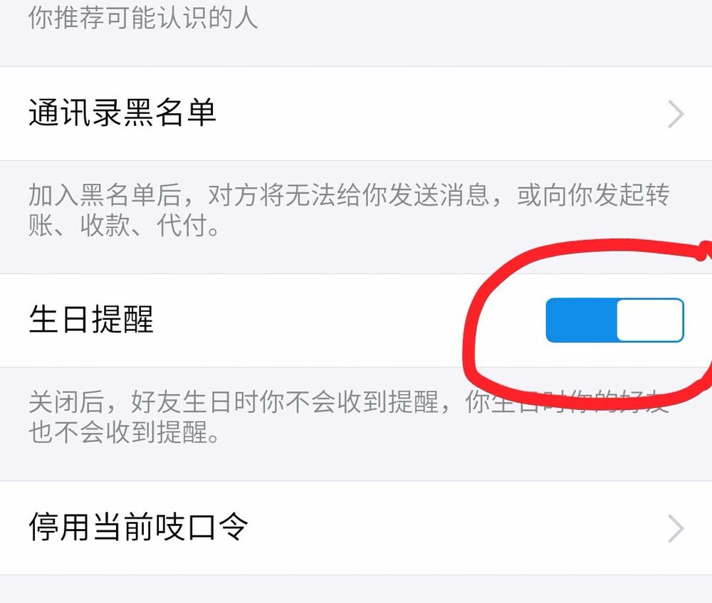 4、拉到最下面,找到生日提醒,打开这个提醒