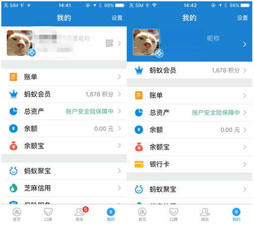 如下图显示,“我的”一栏中,“蚂蚁会员”移动到了顶部,“银行卡”也移动了“余额宝”下面。另外在上方,我的头像昵称背景蓝色填充的面积也增大。虽然改动并不大,但这些变化似乎都是为了“小程序”的出现做准备。