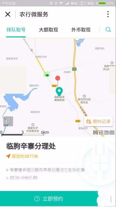 8、点击网点排队功能后,会自动打开地图,显示银行所在的位置,点击下面的“立即预约”按钮