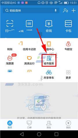1)首先先打开【支付宝】的界面,然后我们再点击【城市服务】,打开后接着点击【养老金资格认证】。(如下图)