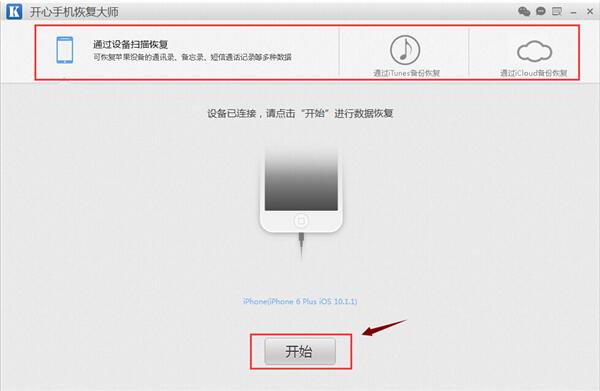 第二步、运行开心手机恢复大师,等待软件识别到设备之后,主界面会出现“设备已连接”的字样,我们只需要点击下方的【开始】即可进入微信好友恢复的模式;