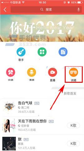 1)我们打开【全民K歌】后点击【唱歌】模式,进入页面后点击【说唱】。(如下图)