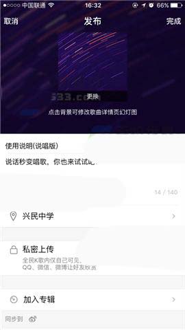 3)然后我们就能够听到自己制作的说唱了,下载相应的副歌可进行更换,点击中下方的【上传】按钮可编辑文字进行发布。(如下图)
