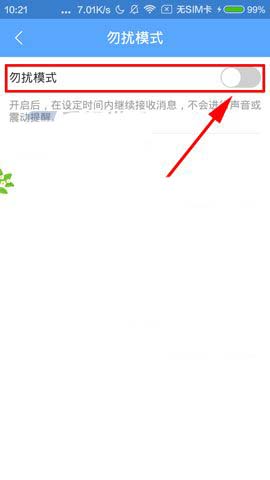 2)然后再点击【勿扰模式】,进去后再点击勿扰模式旁边的【按钮】即可开启。(如下图)