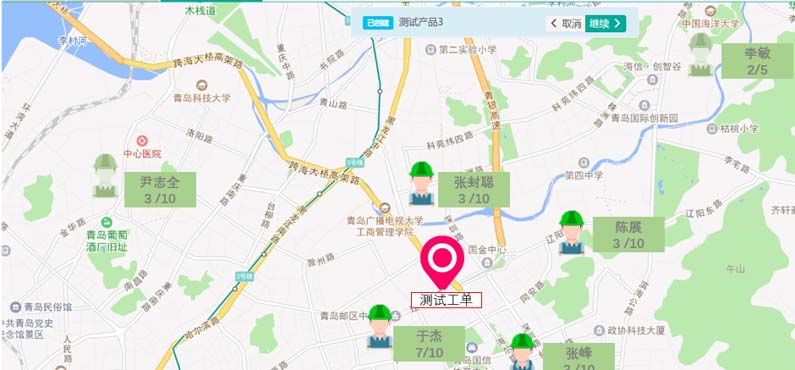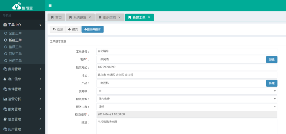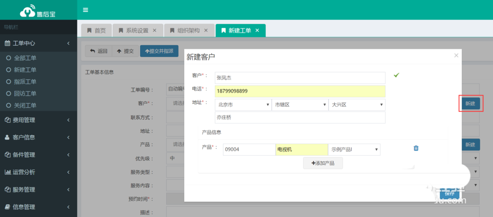 2、新建工单并分配,系统配置好了之后就可以新建工单并分配了,从新建工单中选择客户(客户可以Excel导入),或者新建工单时直接新建客户和产品,分配工单时,可以按照地图派单,这样你就可以派给最近的服务人员,也可以从钉钉通讯录中选择用户派单(记得先把用户加到上一步提到的服务人员组里面)