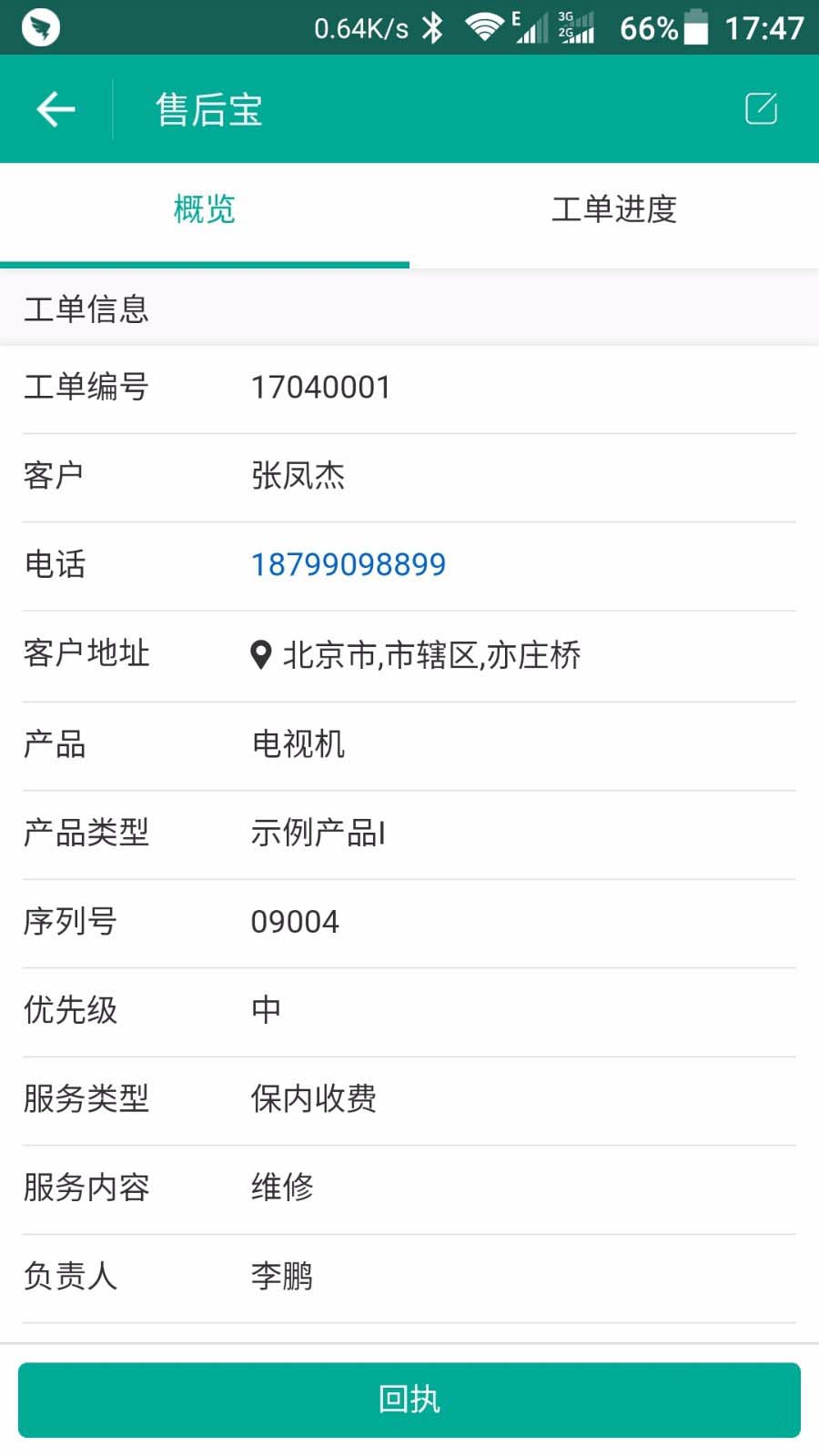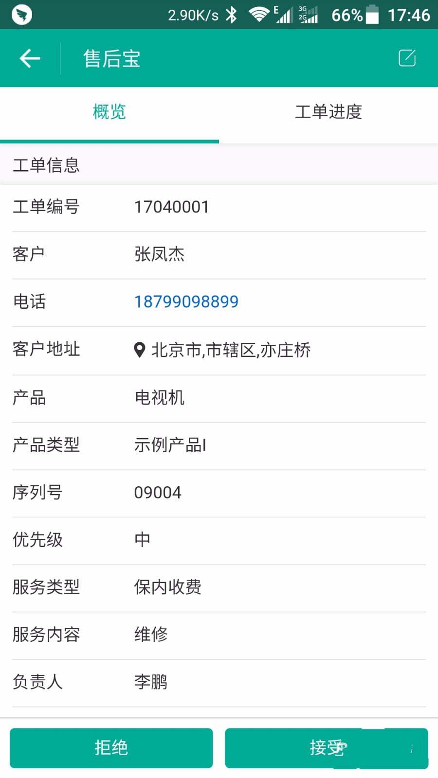 3、工单创建完成后,负责人会在钉钉端收到通知,查看工单,选择是否接受,完成工单后可以通过手机拍照和填写回执及结算信息