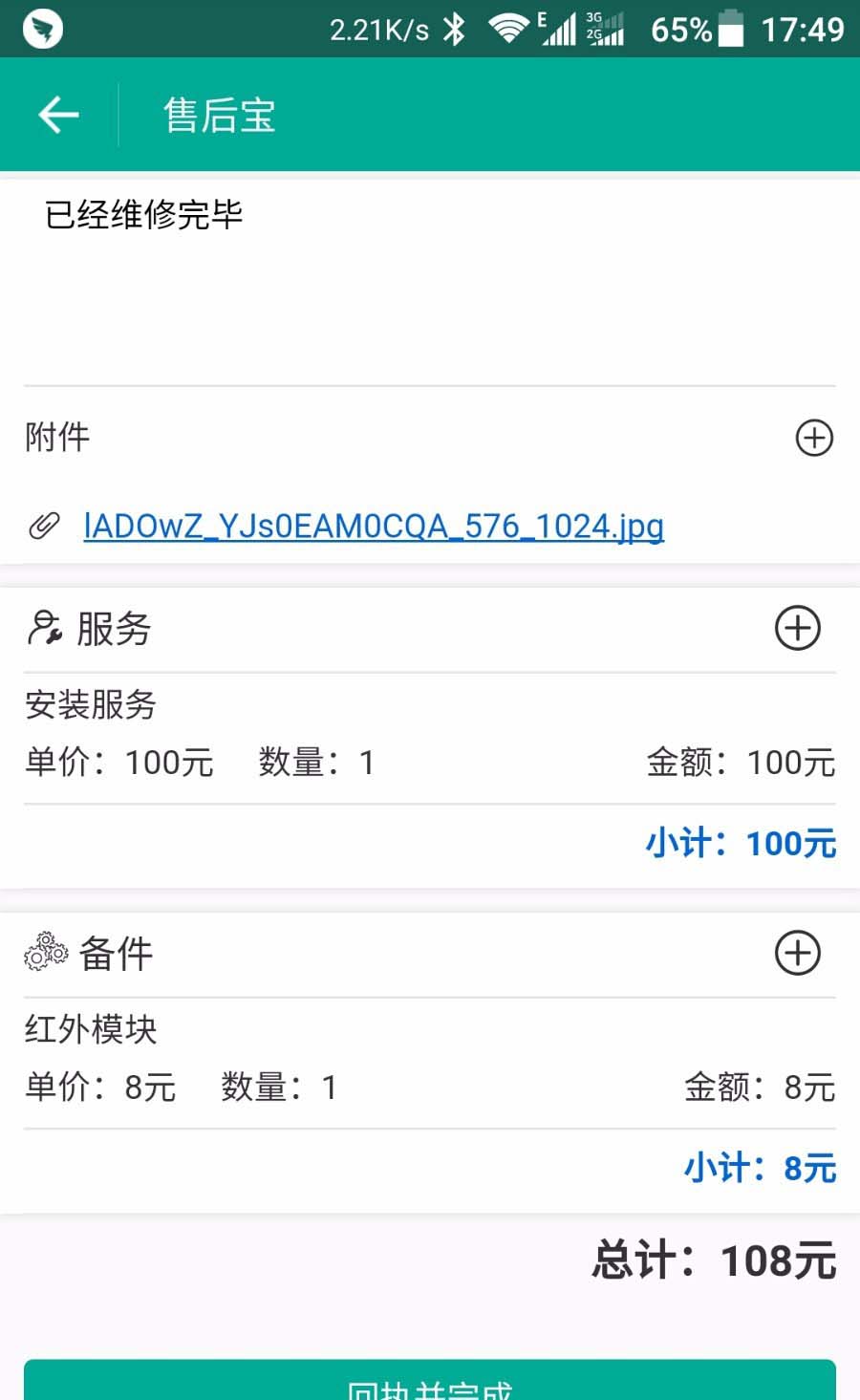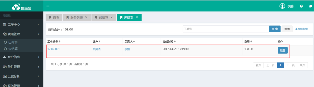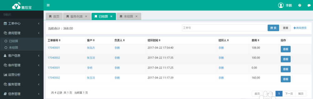 4、服务人员完成工作后,工单管理员都会收到通知,如果涉及到费用结算和客户回访,可以在Web端管理结算信息和回访信息