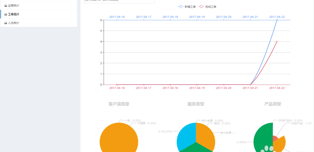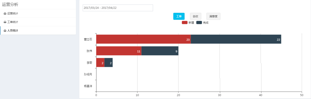 5、一般来说,团队负责人和工单管理员要统计服务团队的绩效,售后宝系统内置了经营分析、工单分析、人员分析图表,可以查看时间段内的服务数据统计。维度还是挺多的,有按时间的筛选,可以看每个人的满意度、工单、收入等等