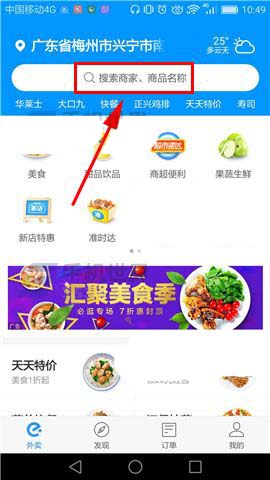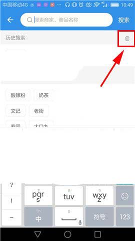 1)首先先打开【饿了么】的界面,然后我们再点击【搜索栏】,点击后接着点击历史搜索的【垃圾桶图标】。(如下图)
