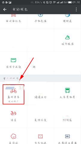 2)进入到钱包界面后下滑找到【摩拜单车】点击进去,进去后【登陆账号】即可使用了。(如下图)
