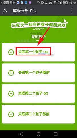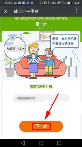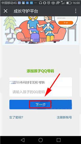 3)打开我的孩子之后选择你要关联的选择,【比如QQ】,打开后填好手机号码和验证码,然后再点击【下一步】。(如下图)