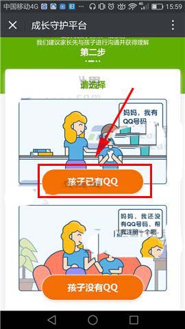 4)点击下一步后会跳转到一个页面,然后点击【孩子已有QQ】,打开后填好QQ号码和密码,然后再点击【下一步】。(如下图)