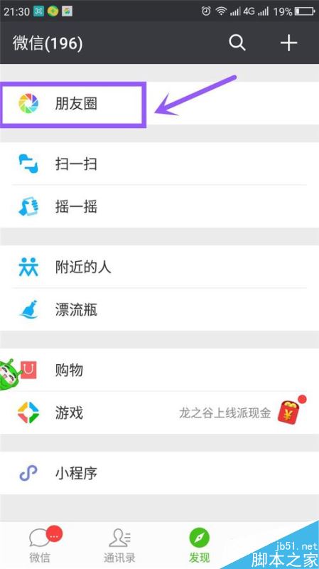 在出现的页面中,点击“朋友圈”一项,如图所示意。