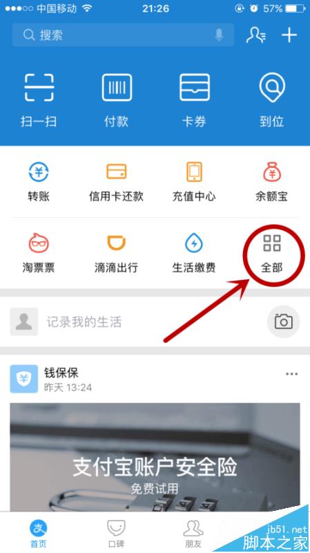 1、打开支付宝,最新版的支付宝改了很多,也加了很多功能,点击“全部”就可以了。