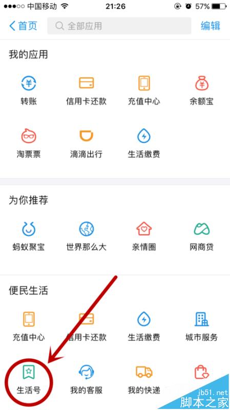 2、点击进去之后,往下面拉一点,找 便民生活-“生活号”,看到“生活号”就点击进去。