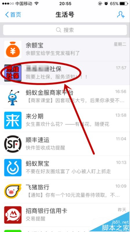 3、点击“搜索栏”在搜索栏里输入:“社保”,“点击如下图生活号”点击进入即可。
