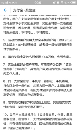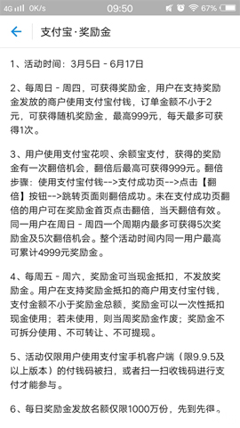 经常使用微信支付的小伙伴知道,微信扫码支付后,有“鼓励金”,可以在周末抵扣现金使用。现在,支付宝推出了一项类似的服务:奖励金。周日-周四订单金额不小于2元立得奖励金,周五-周六当现金抵扣。