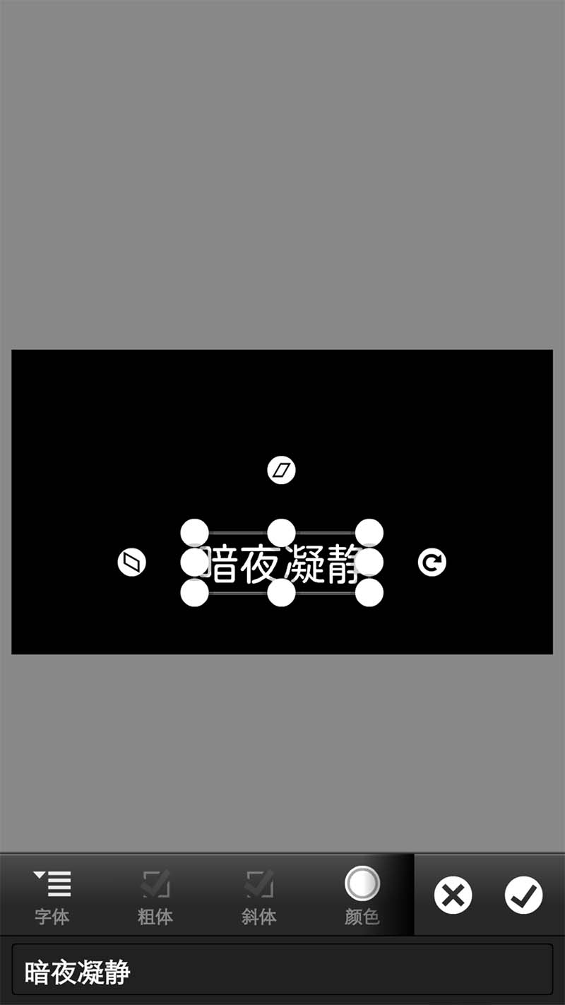 3、选择文本,输入“暗夜凝静”,字体颜色设为白色,并调整字的大小位置。
