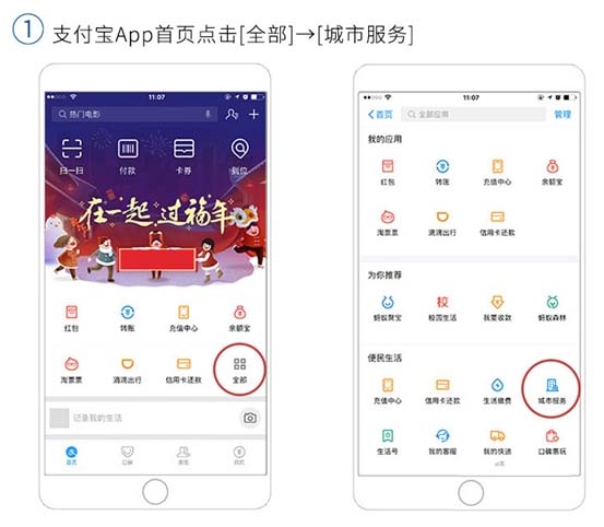 1、打开手机支付宝,在首页位置找到“全部”点击进入后,找到“城市服务”