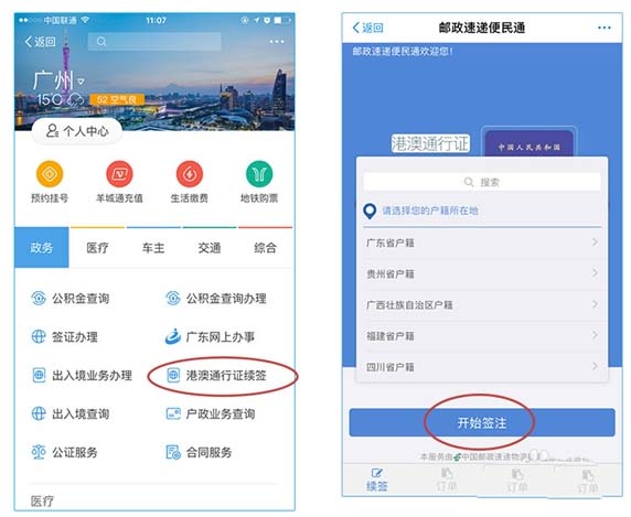 2、点击“港澳通行证续签”,之后选择好户籍所在地,点击“开始签注”