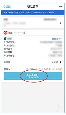 5、确认信息没有错误后,点击支付。然后就等快递人员上门取件了,然后可以在支付宝中关注制件情况,制件完成后快递人员会把证件给你的。