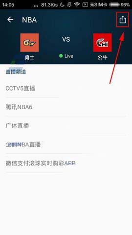 1)我们先打开软件【点击】进入要分享的赛事直播,然后点击右上角的分享的【图案】。(如下图)
