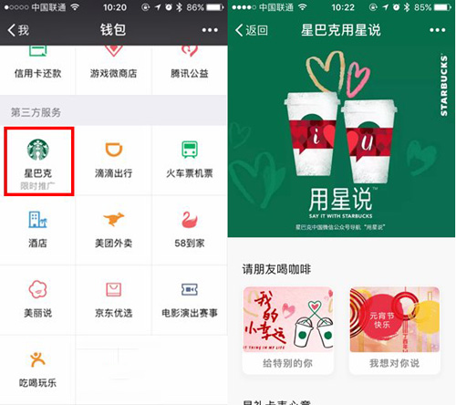 微信用户可以点击进入微信钱包,找到第三方服务,便可看到功能入口,目前还属于阶段性入口,下方显示“限时推广”字样。用户还可以关注“星巴克中国”官方微信公众号,进入菜单栏,找到“用星说”,使用该功能。