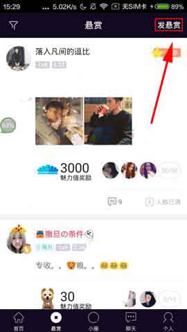 1)我们先打开软件点击【悬赏】,接着再点击右上角的【发悬赏】。(如下图)